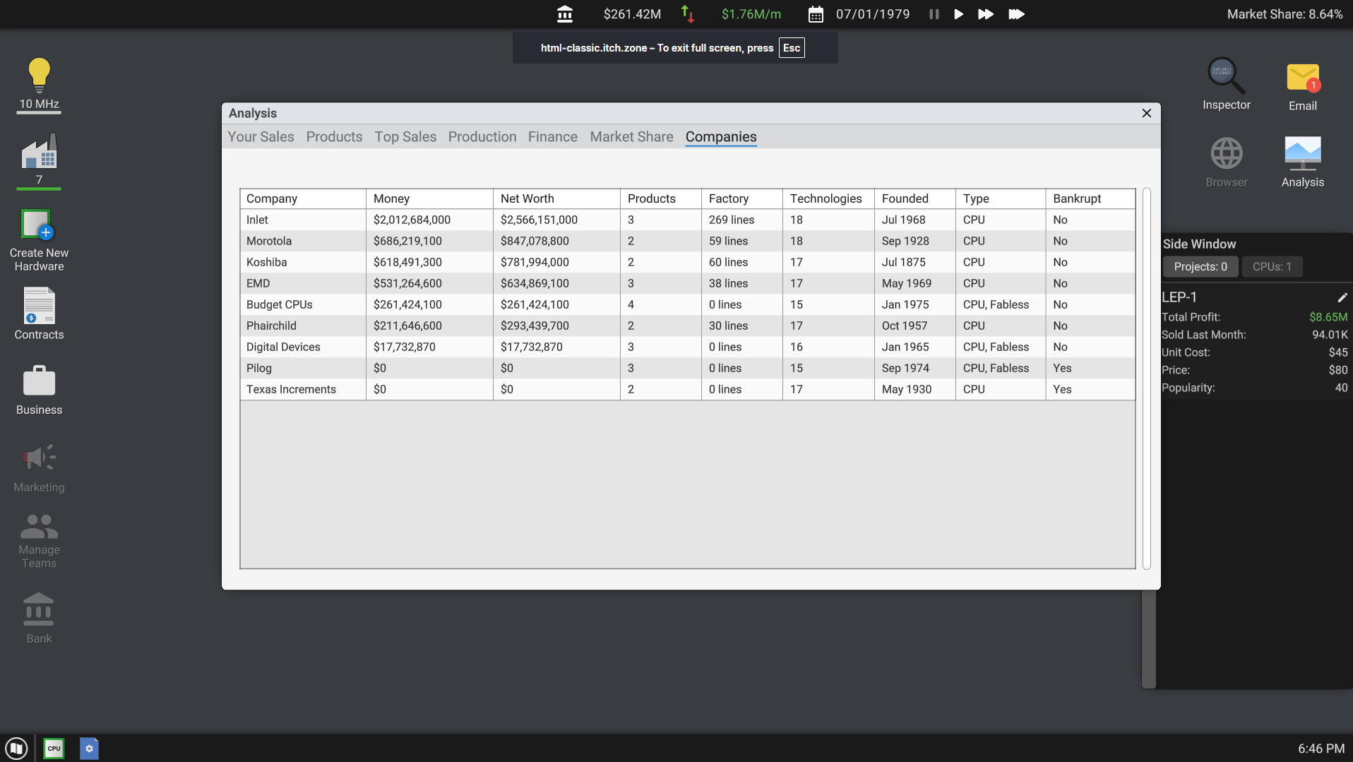 its a quite good game already but it need more player feedback as polishing. Some commented about a tutorial and i agree but beyond that it need a metric/system to avoid the player to "shoot CPUs in the dark". I managed to survive to around 1985 but i have no exact idea why a CPU is sucessfull or not. Beyond MIPS and price.